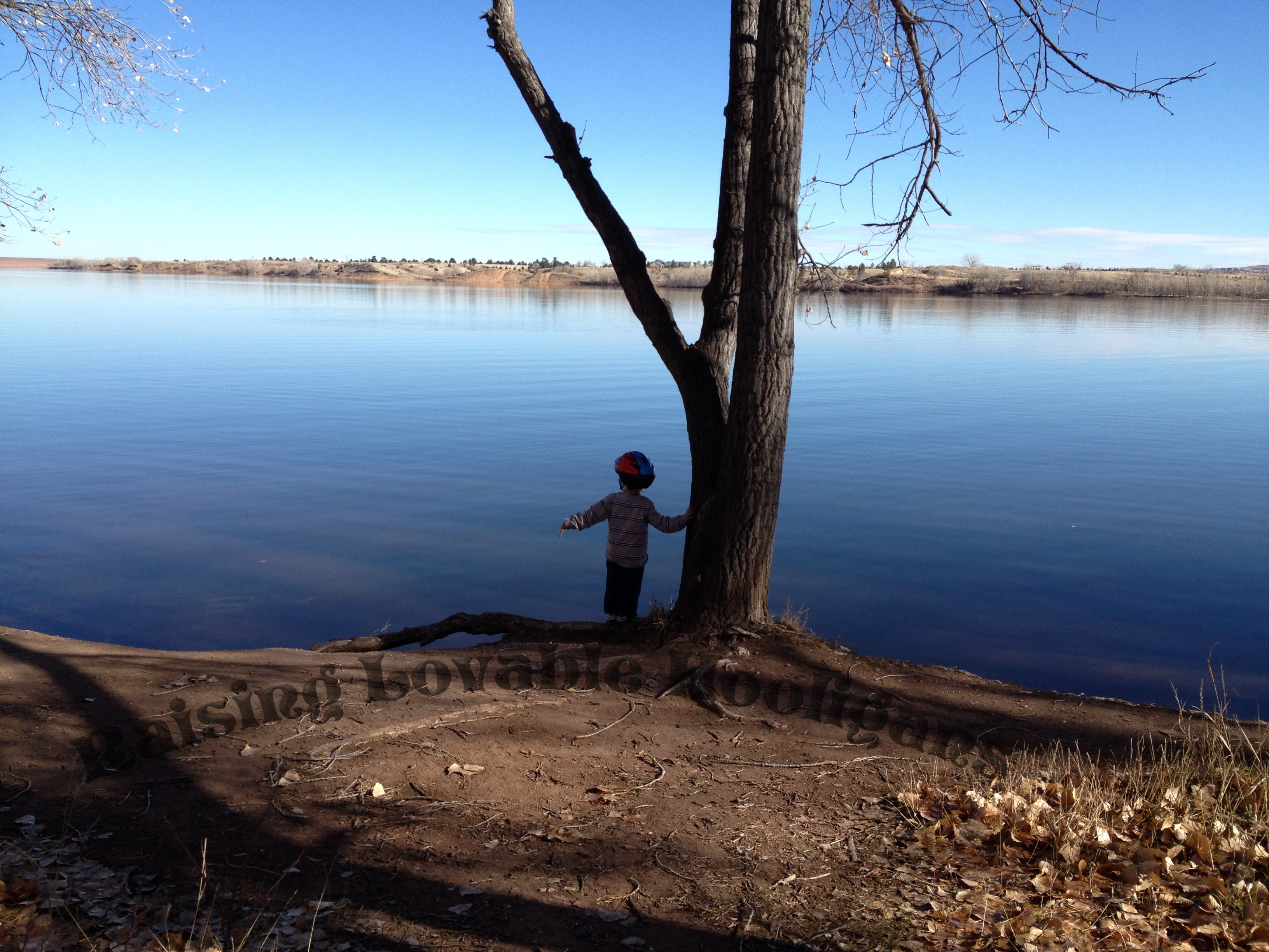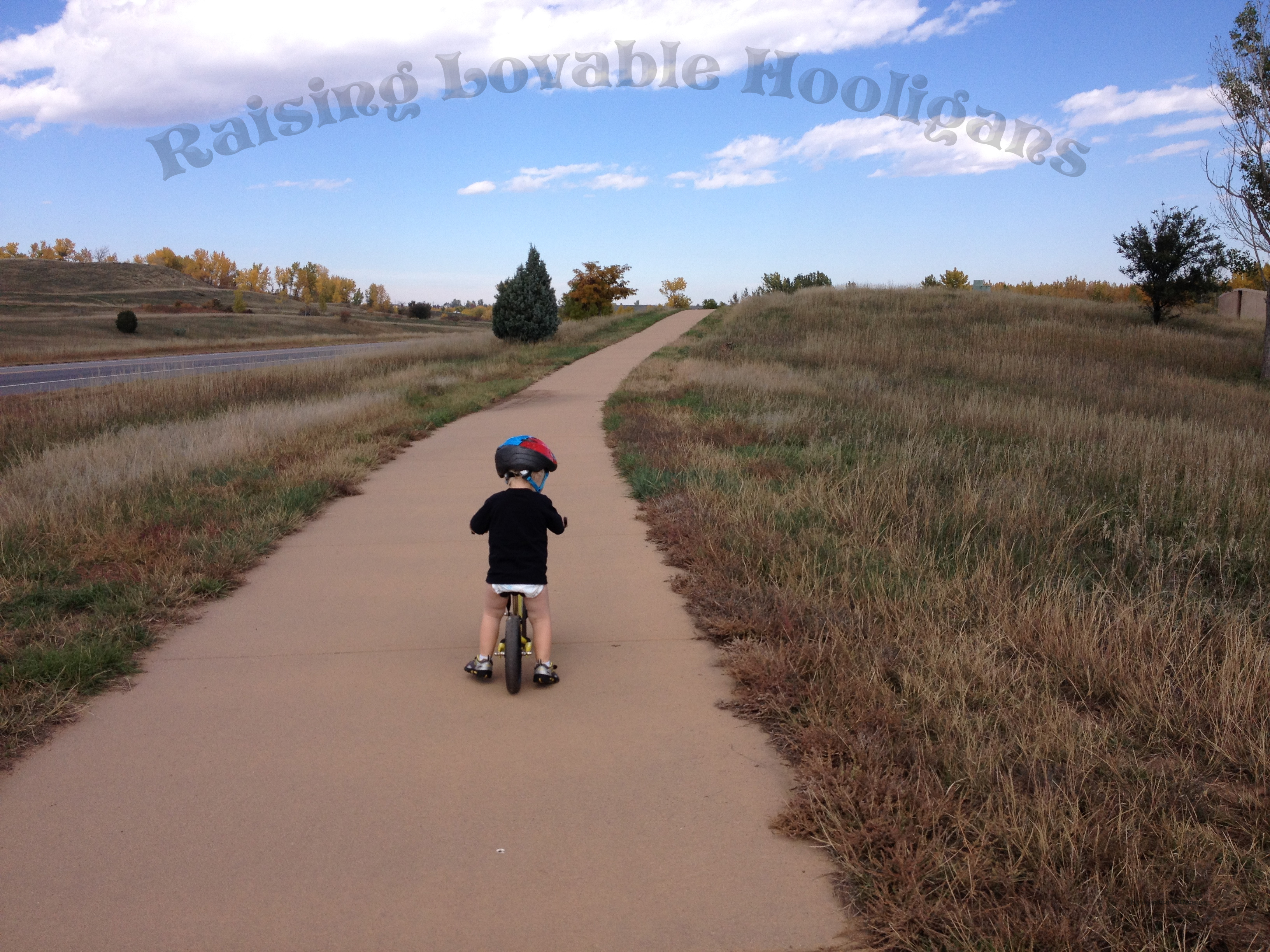 If you wander into the trees you’ll discover a secluded little trail that curves along the water. It’s gorgeous and makes you forget you’re right outside of Denver. This spot is one of our favorite spots for “mountain” biking. My daughter rides a two-wheeler you’d see any other kid with, nothing fancy or expensive. Actually, the bike might be heading toward ridiculously small as we hold out just a little longer before buying her a bigger bike. After all, if your knees get bruises from hitting the handle bars that builds character! My son rides a balance bike. For those who are considering training wheels I would highly recommend looking into balance bikes. They are brilliant! These bikes will increase the heart rate of all adults involved but my 3-year-old is able to ride down hills and take turns with admirable skill. Helmets are an absolute must. Well, helmets and a splash of confidence in your offspring are both essential.